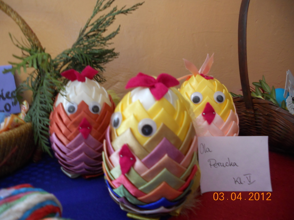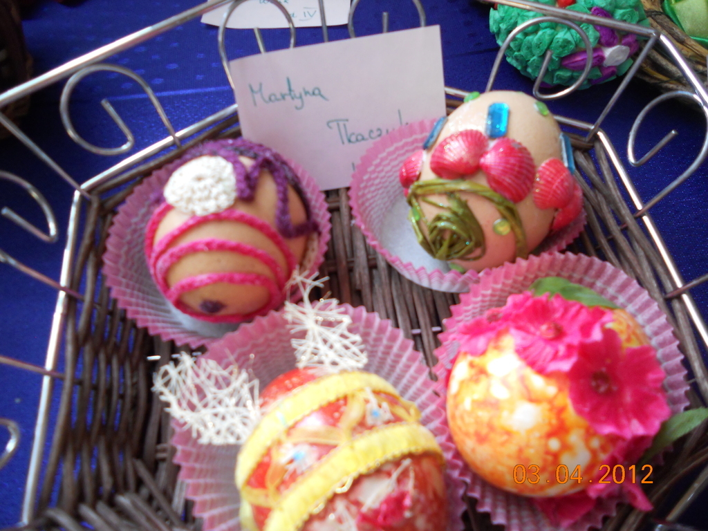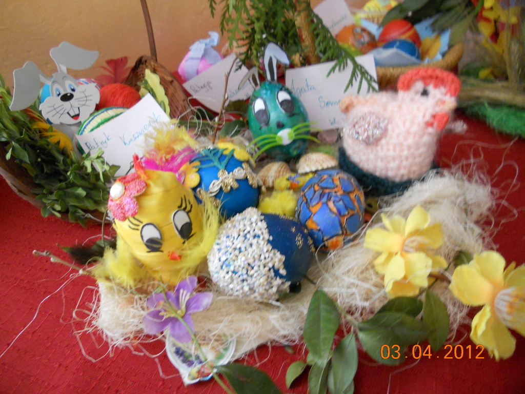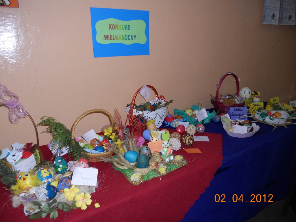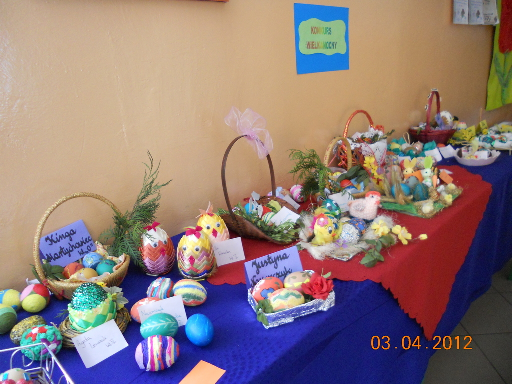 W dniu 04.04 2012r. rozstrzygnięto konkurs na najładniejszą „Pisankę Wielkanocną”. Do konkursu przystąpiło 30 uczestników. Prezentowane pisanki wykonane były za pomocą różnorodnych i technik. Dzieci wykazały się wielką pomysłowością. Jury wyróżniło prace następujących uczniów:
