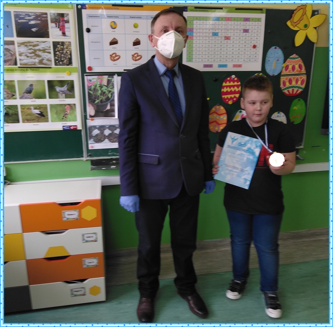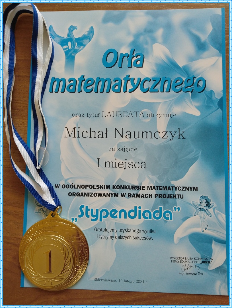 W grudniu 2020 r. uczniowie z klasy II brali udział w Ogólnopolskim Projekcie Stypendialnym: Stypendiada Wczesnoszkolna dla klas 2 organizowanym przez Firmę Edukacyjną „Orzeł”. Startowali w trzech konkursach: czytelniczym „Abecadło”, matematycznym „Plusik”, plastycznym „Plastuś”. Miło jest nam poinformować, że Michał Naumczyk z klasy II otrzymał Orła matematycznego oraz tytuł Laureata za zajęcie I miejsca w Ogólnopolskim Konkursie Matematycznym organizowanym w ramach projektu „Stypendiada”. W dniu 19.03.2021 r. pan dyrektor Henryk Wyszyński uroczyście wręczył Michałowi dyplom oraz złoty medal. Wszyscy uczestniczy konkursu otrzymali dyplomy uczestnika. Serdecznie gratulujemy Michałowi uzyskanego wyniku i życzymy kolejnych sukcesów. Szkolnym koordynatorem Ogólnopolskiego konkursu „Stypendiada” była pani Urszula Kaźmieruk.