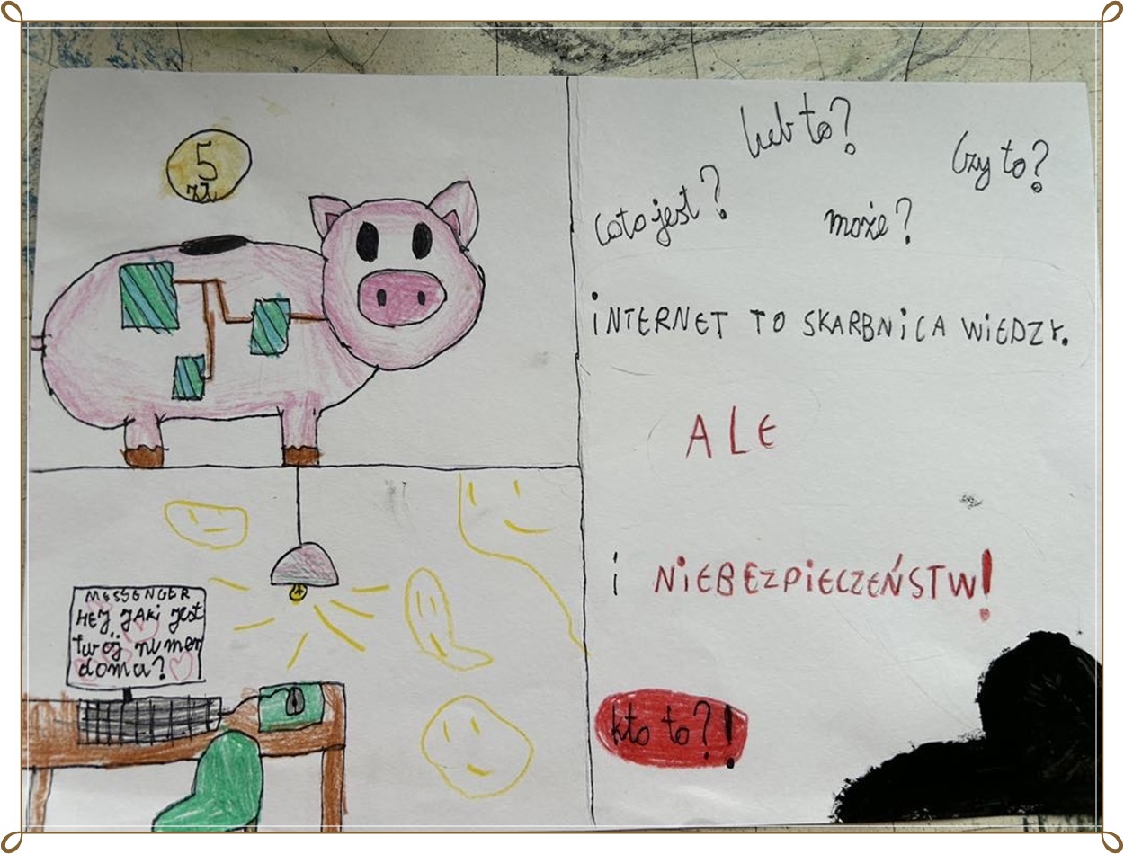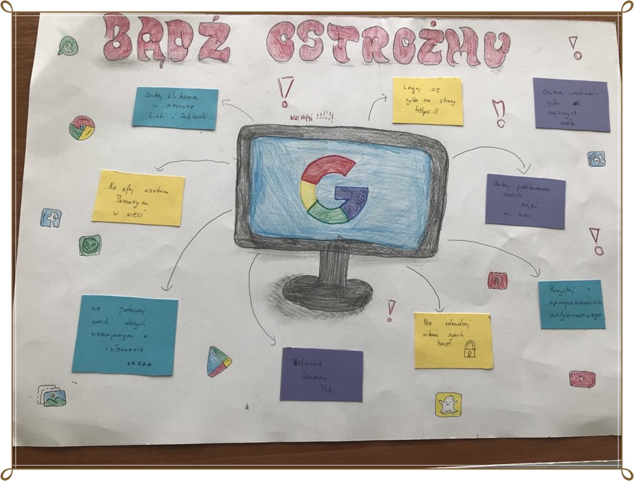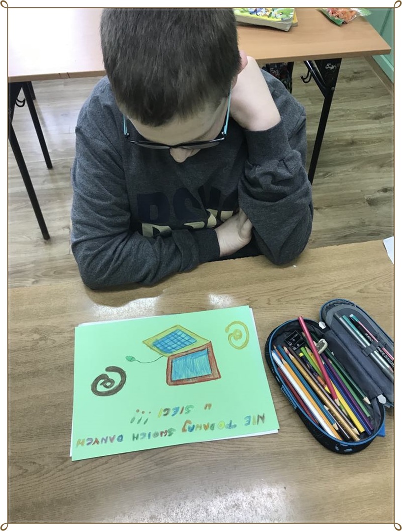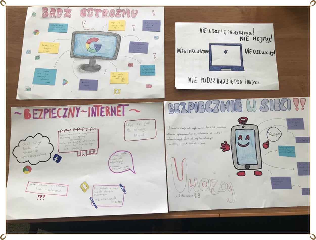 - Po zajęciach edukacyjnych uczniowie wykonywali plakaty i rysunki na temat zagrożeń jakie mogą ich spotkać w sieci i jak ich unikać. Prace prezentowane były na szkolnych gazetkach.