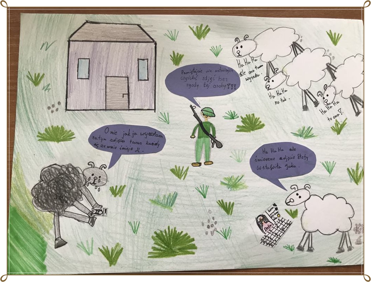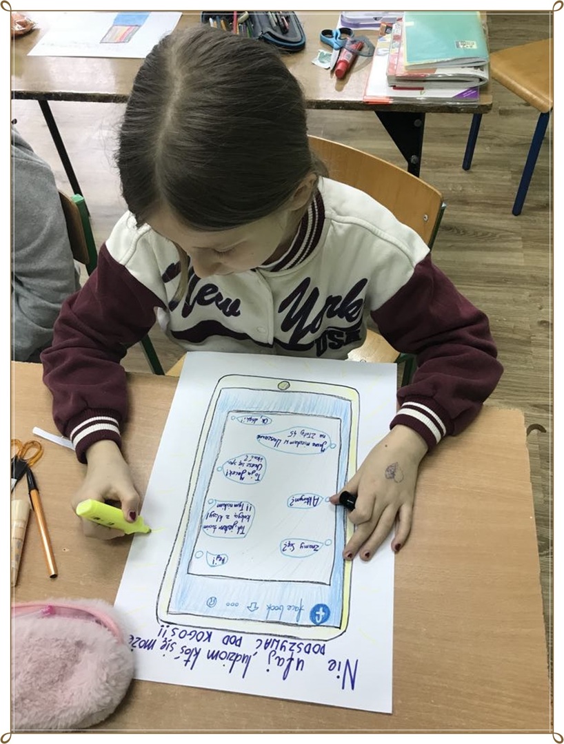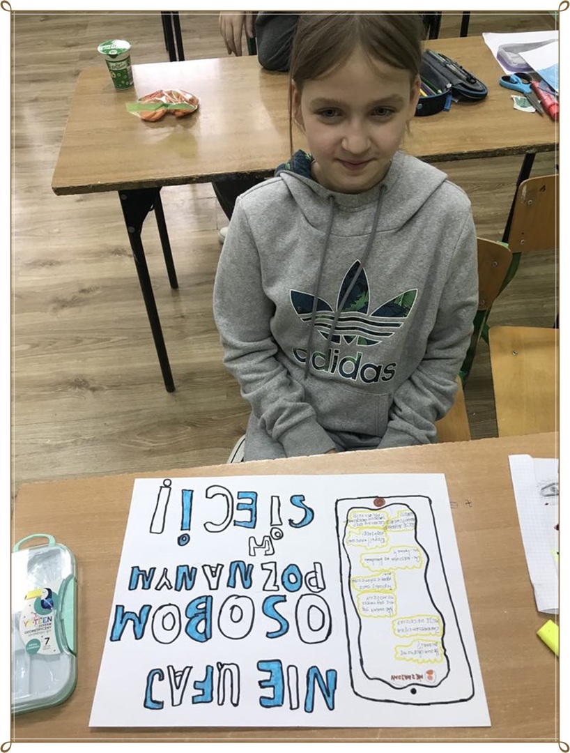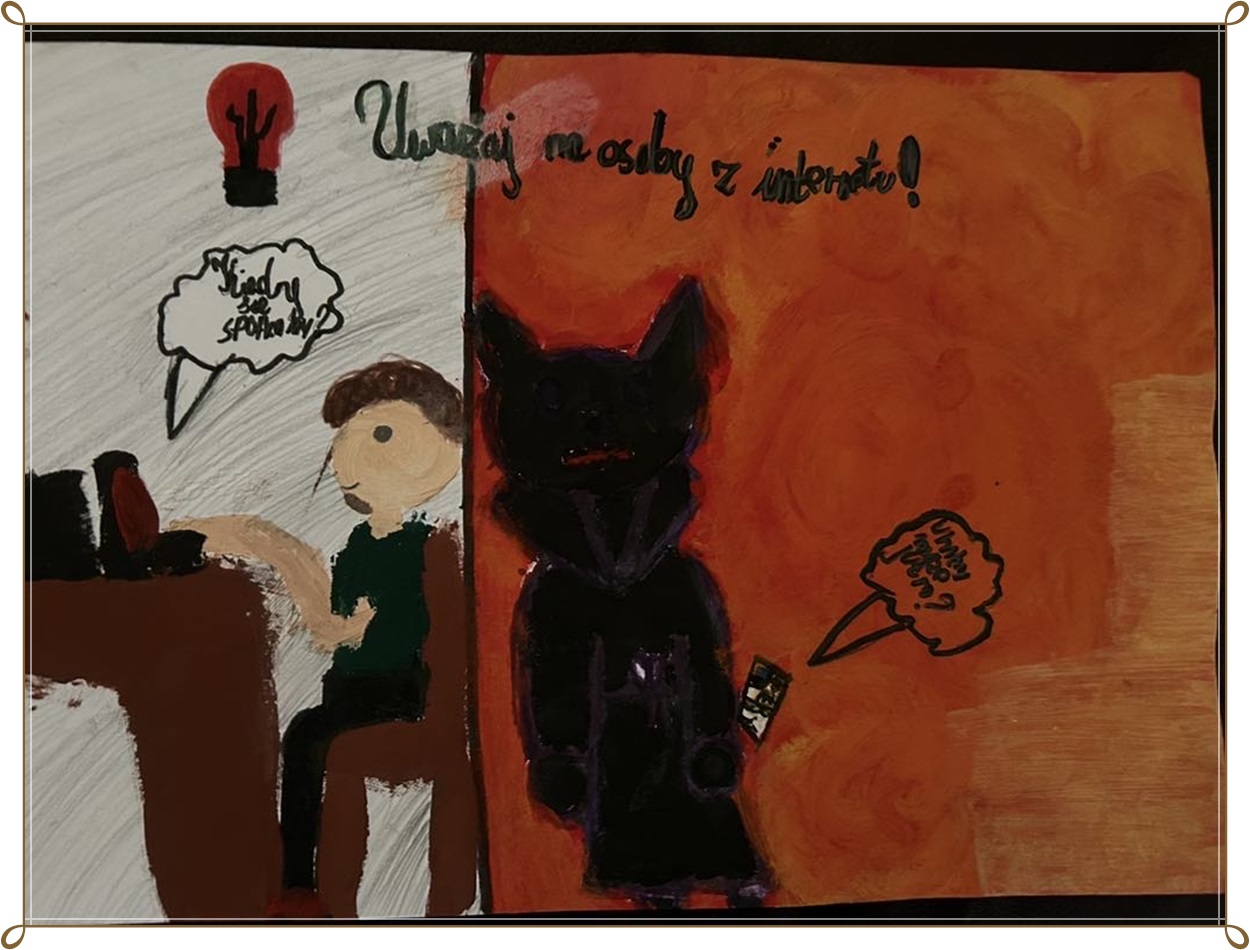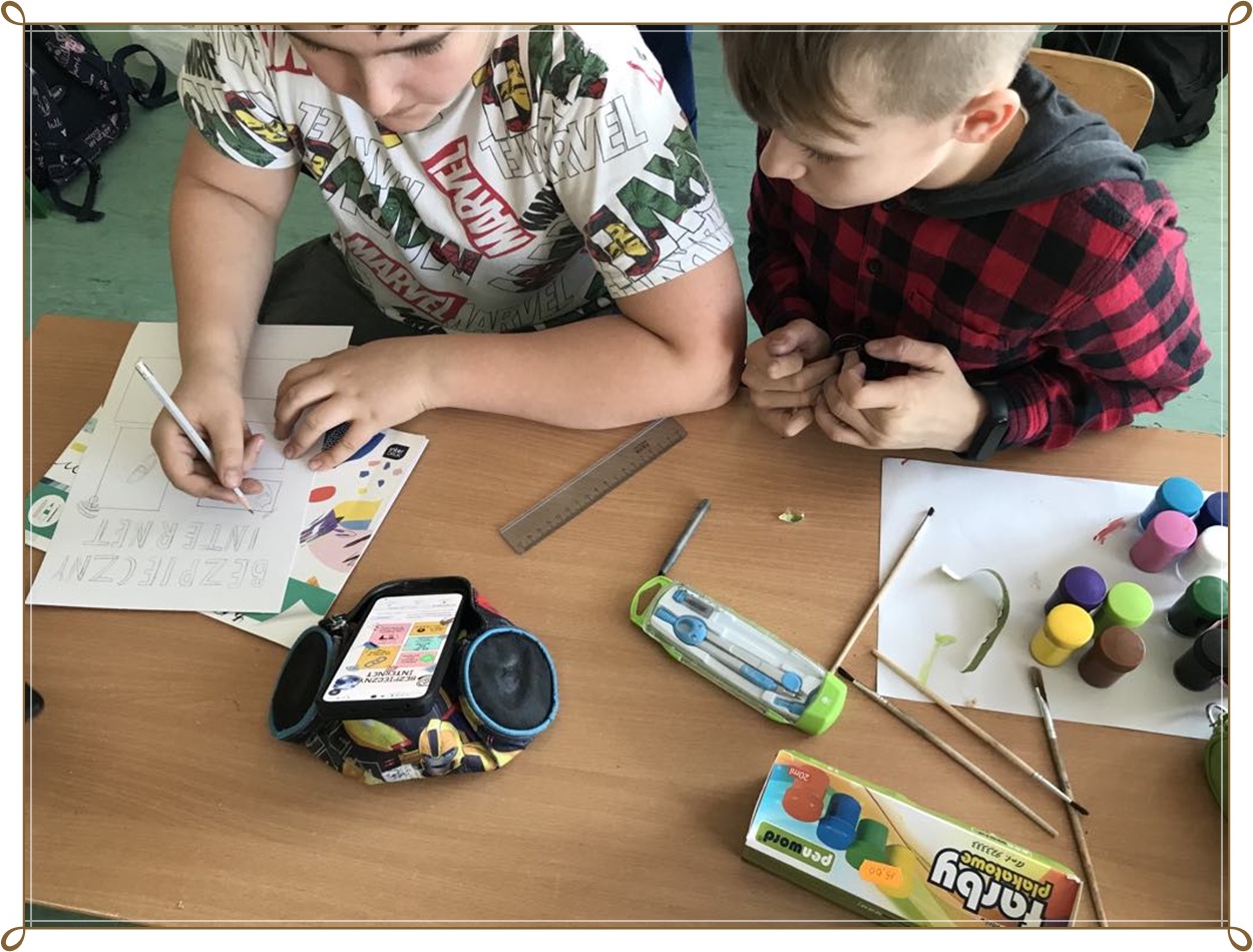 - Po zajęciach edukacyjnych uczniowie wykonywali plakaty i rysunki na temat zagrożeń jakie mogą ich spotkać w sieci i jak ich unikać. Prace prezentowane były na szkolnych gazetkach.