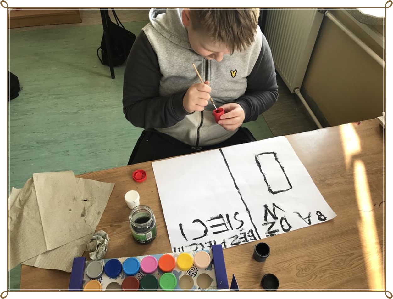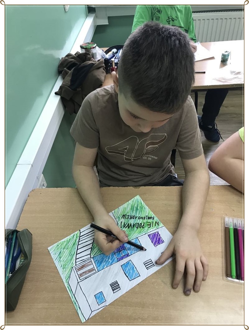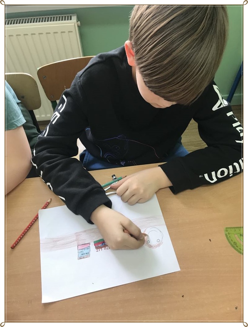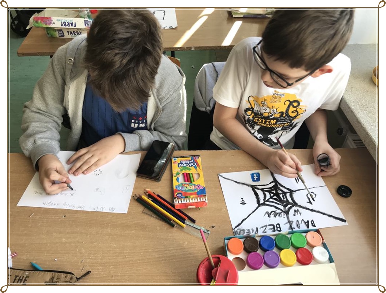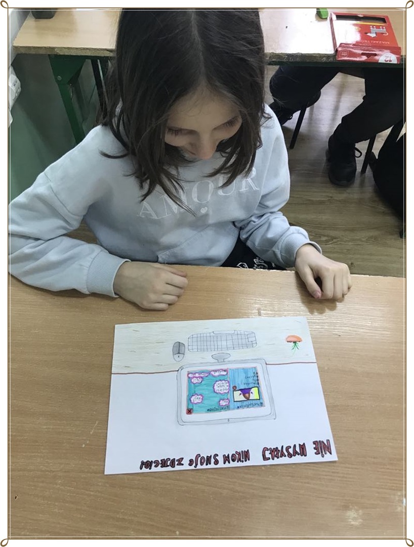 - Po zajęciach edukacyjnych uczniowie wykonywali plakaty i rysunki na temat zagrożeń jakie mogą ich spotkać w sieci i jak ich unikać. Prace prezentowane były na szkolnych gazetkach.