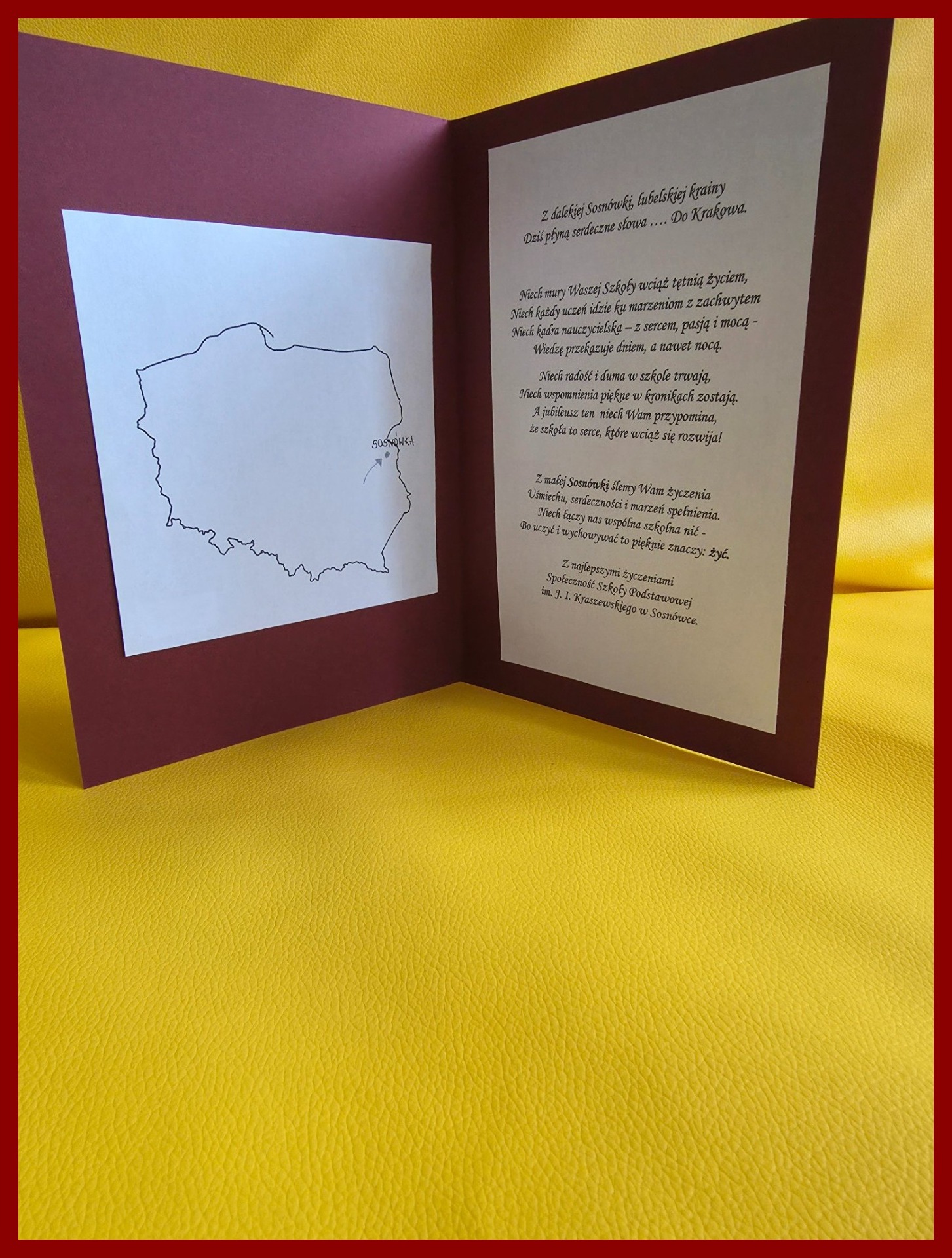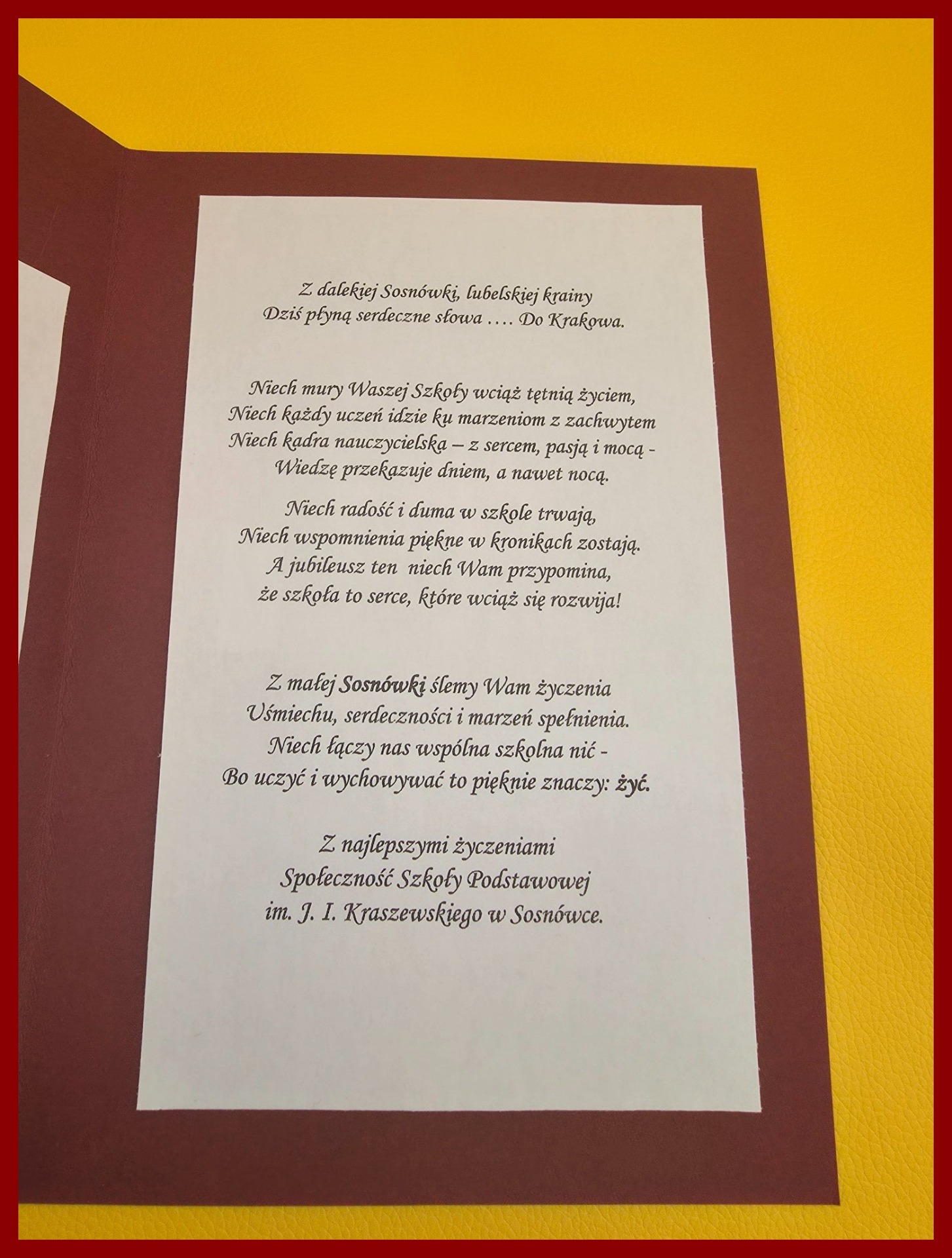 Nasza szkoła wzięła udział w wyjątkowej akcji „60 kartek na 60-lecie szkoły”, zorganizowanej z okazji jubileuszu Szkoły Podstawowej im. Arkadego Fiedlera w Krakowie. W ramach przedsięwzięcia uczniowie pod opieką pani Magdaleny Sielskiej wykonali własnoręcznie kartkę okolicznościową oraz złożyli życzenia w formie wiersza. Za kompozycję wiersza odpowiadała pani Dorota Stawinoga, która pięknie wyraziła nasze serdeczne pozdrowienia i gratulacje krakowskiej szkole. Już we wrześniu 2026 roku w Krakowie powstanie wystawa prezentująca wszystkie otrzymane kartki, również tę, którą wysłaliśmy z naszej szkoły. Niech cały Kraków dowie się o dalekiej Sosnówce z lubelskiej krainy, miejscu pełnym życzliwości, kreatywności i otwartości na współpracę z innymi!