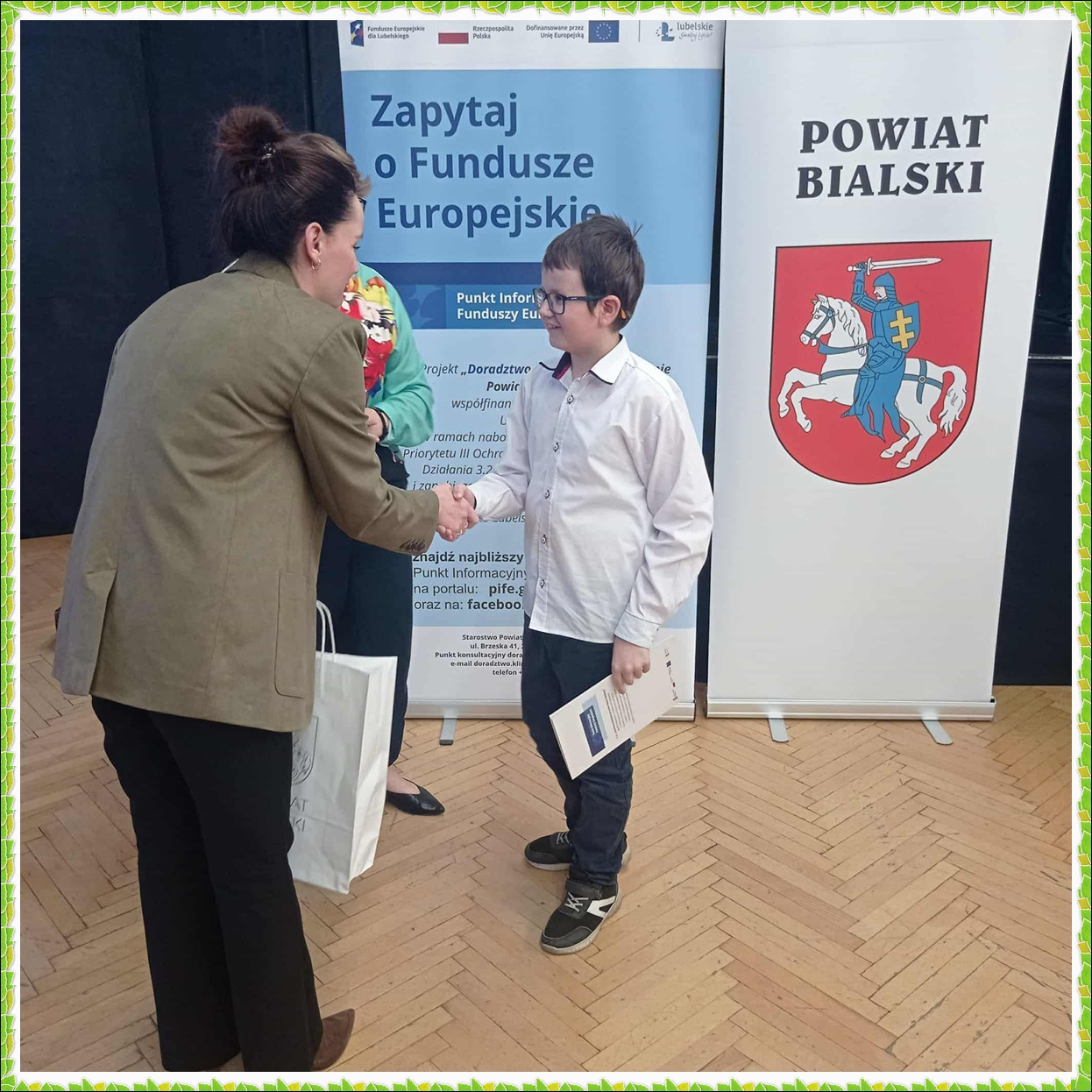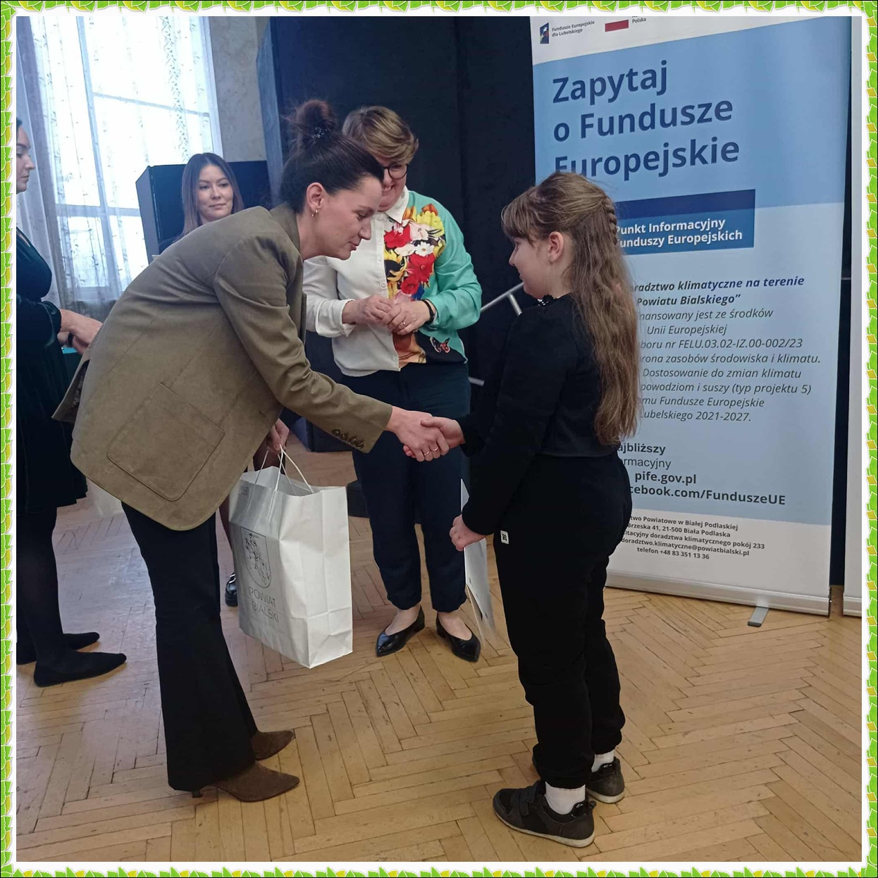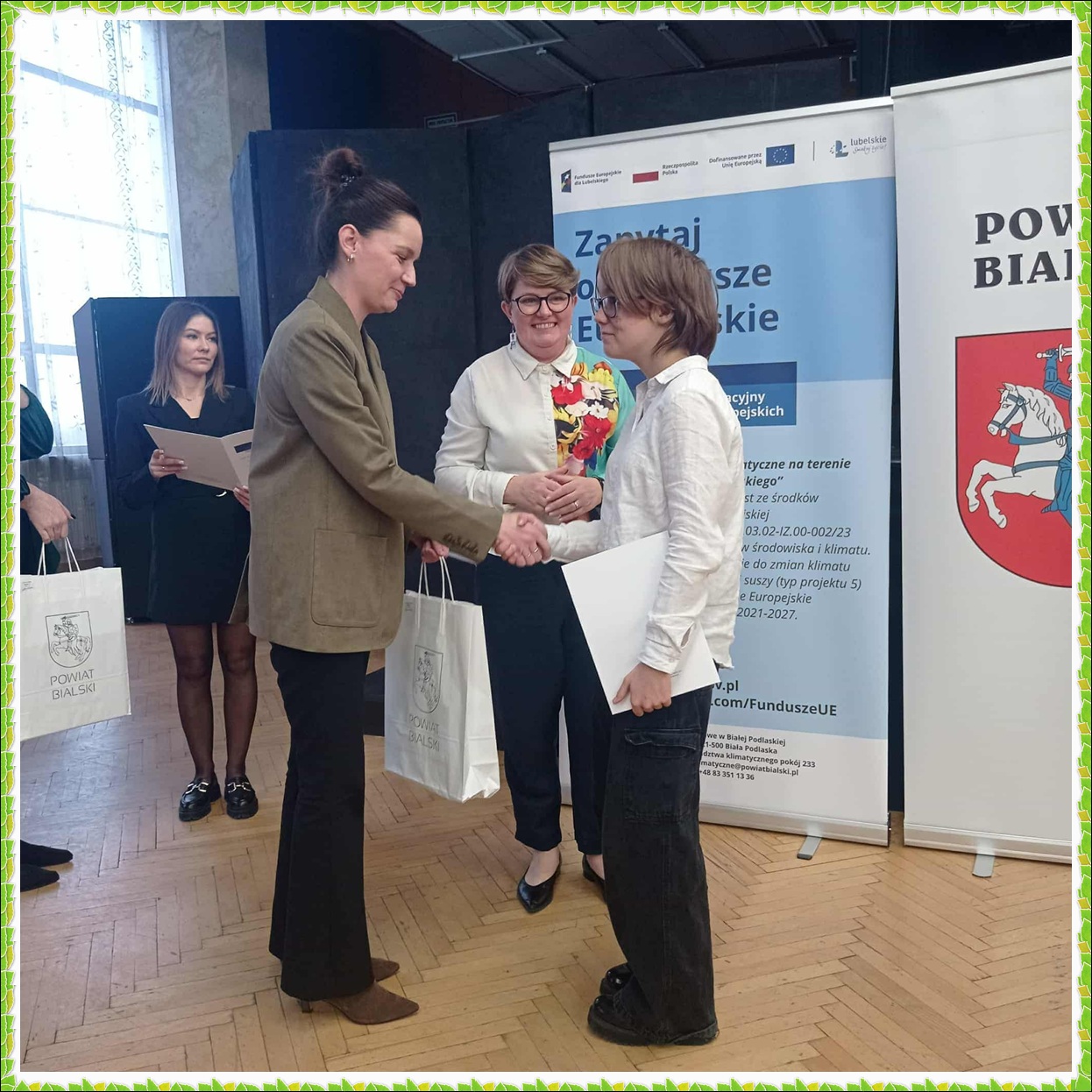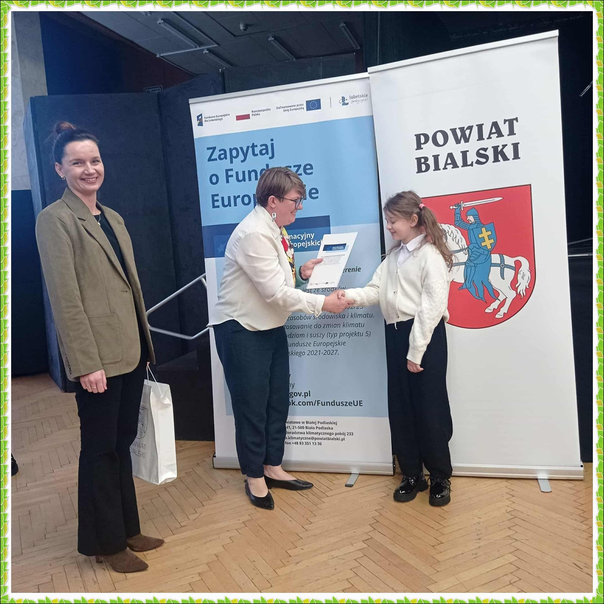 W dniu 21 listopada 2025 roku w Starostwie Powiatowym w Białej Podlaskiej odbyło się uroczyste podsumowanie konkursu plastycznego „Ziemia daje życie – dbaj o nią należycie!”. W konkursie wzięło udział 686 uczniów ze szkół podstawowych z powiatu bialskiego. Wśród laureatów znaleźli się uczniowie naszej szkoły: