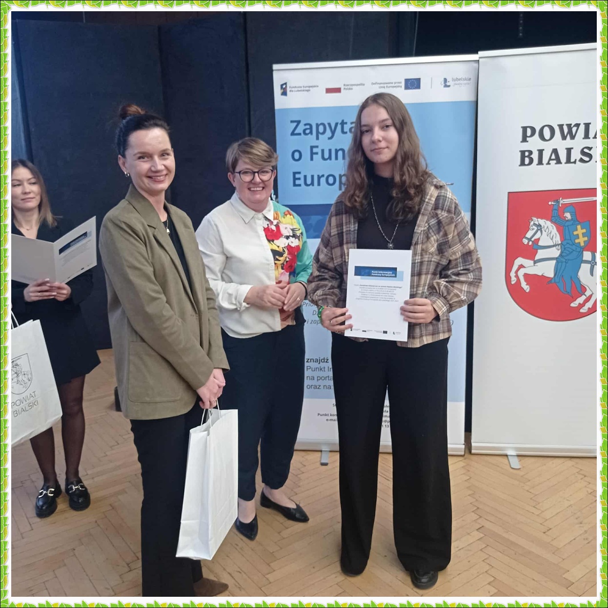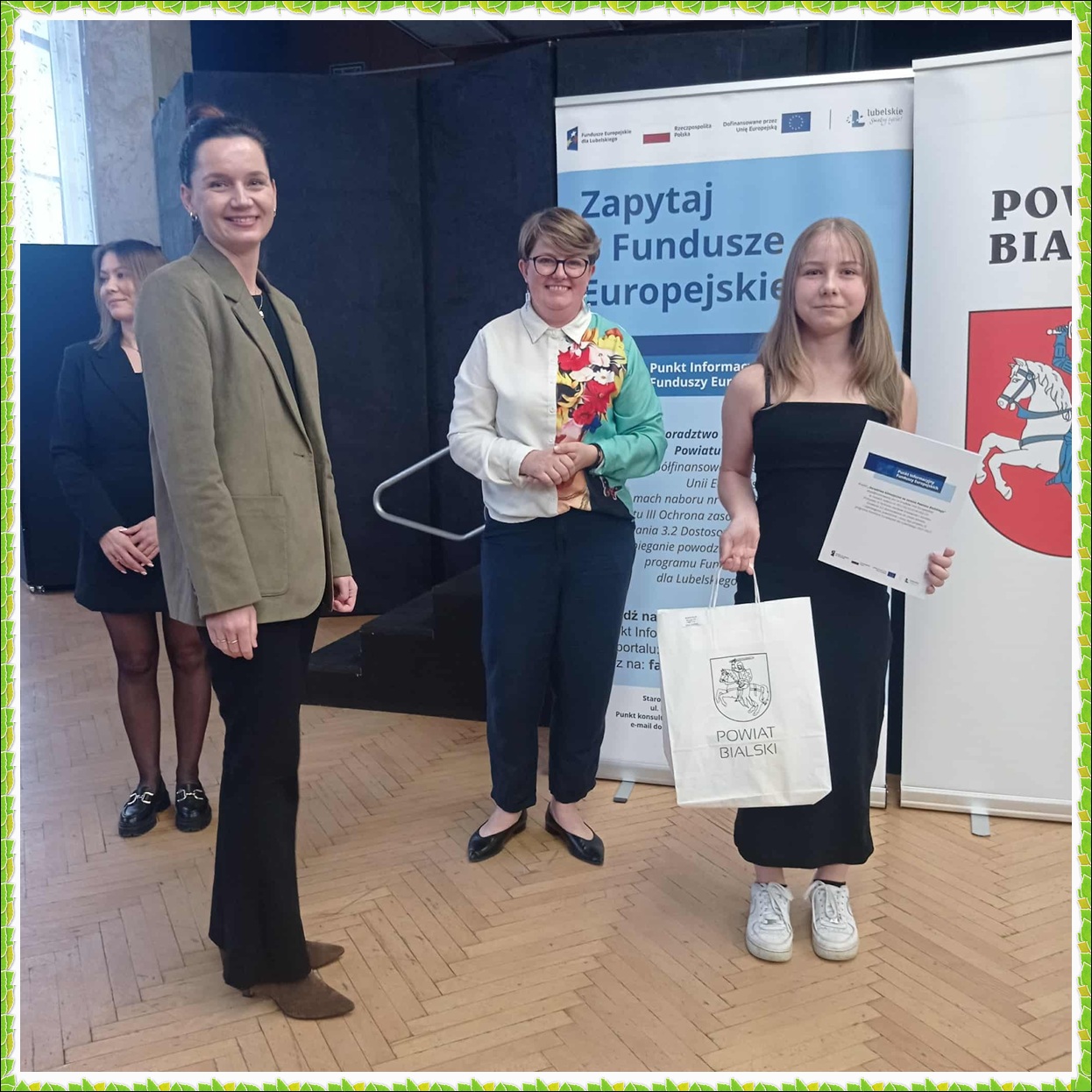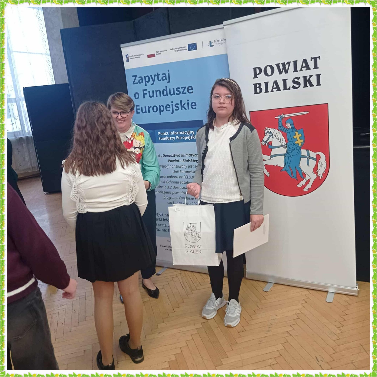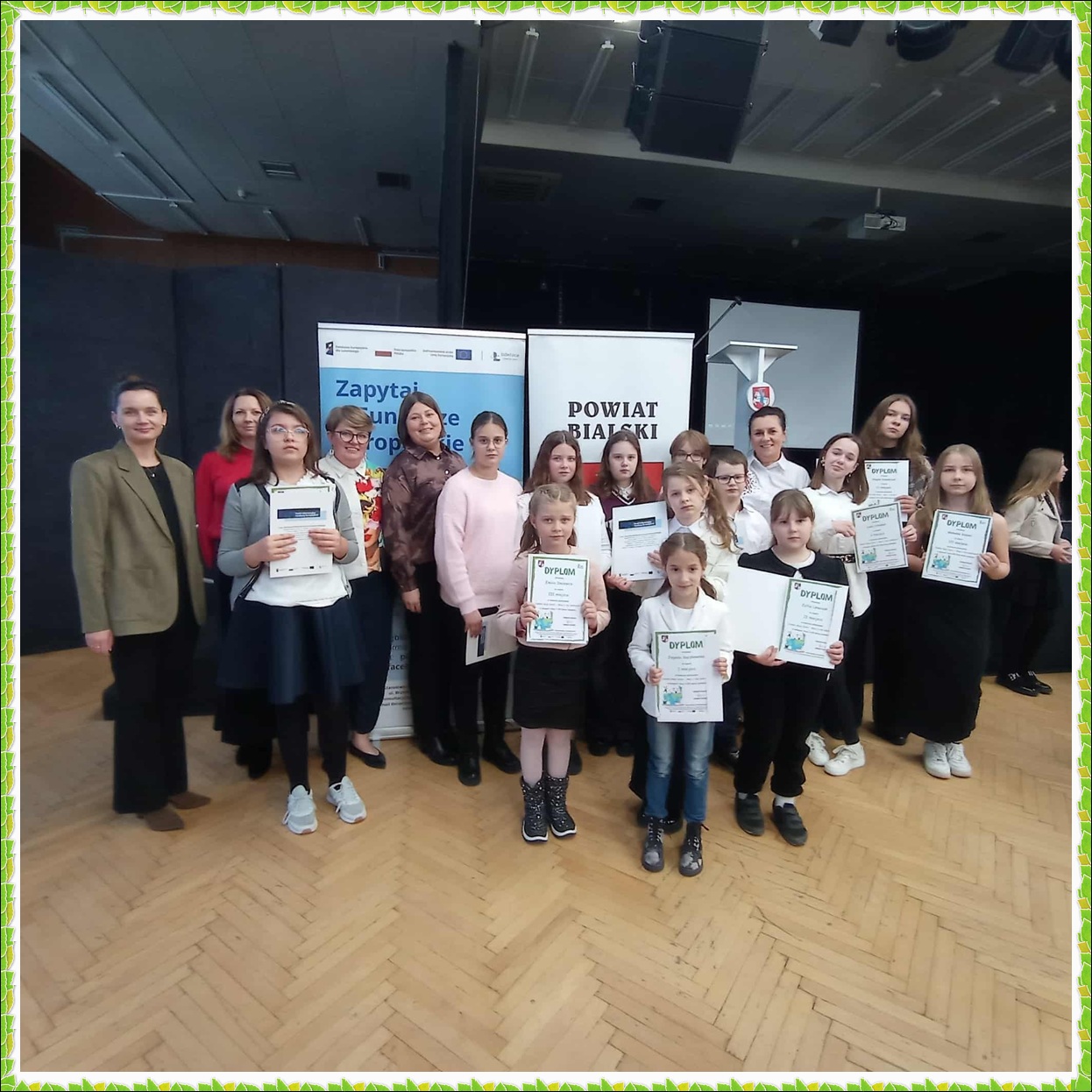 W dniu 21 listopada 2025 roku w Starostwie Powiatowym w Białej Podlaskiej odbyło się uroczyste podsumowanie konkursu plastycznego „Ziemia daje życie – dbaj o nią należycie!”. W konkursie wzięło udział 686 uczniów ze szkół podstawowych z powiatu bialskiego. Wśród laureatów znaleźli się uczniowie naszej szkoły: