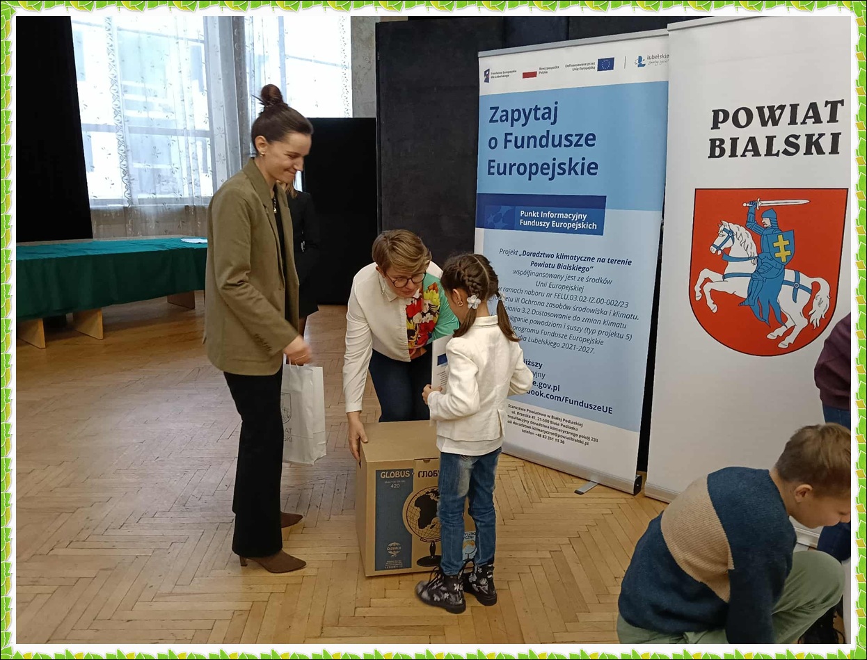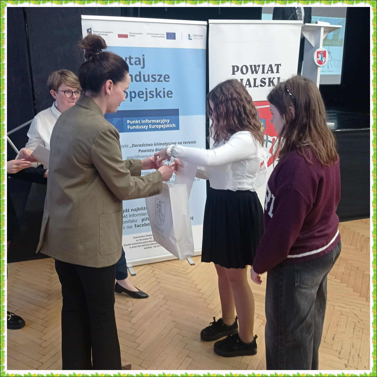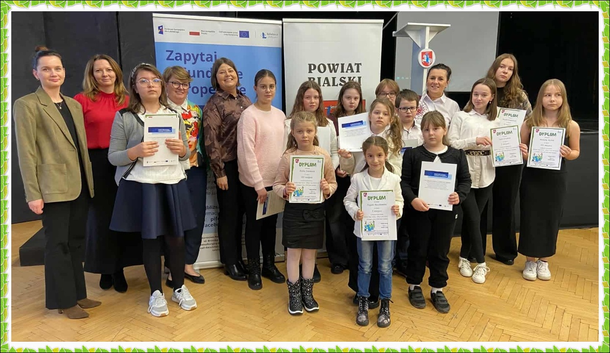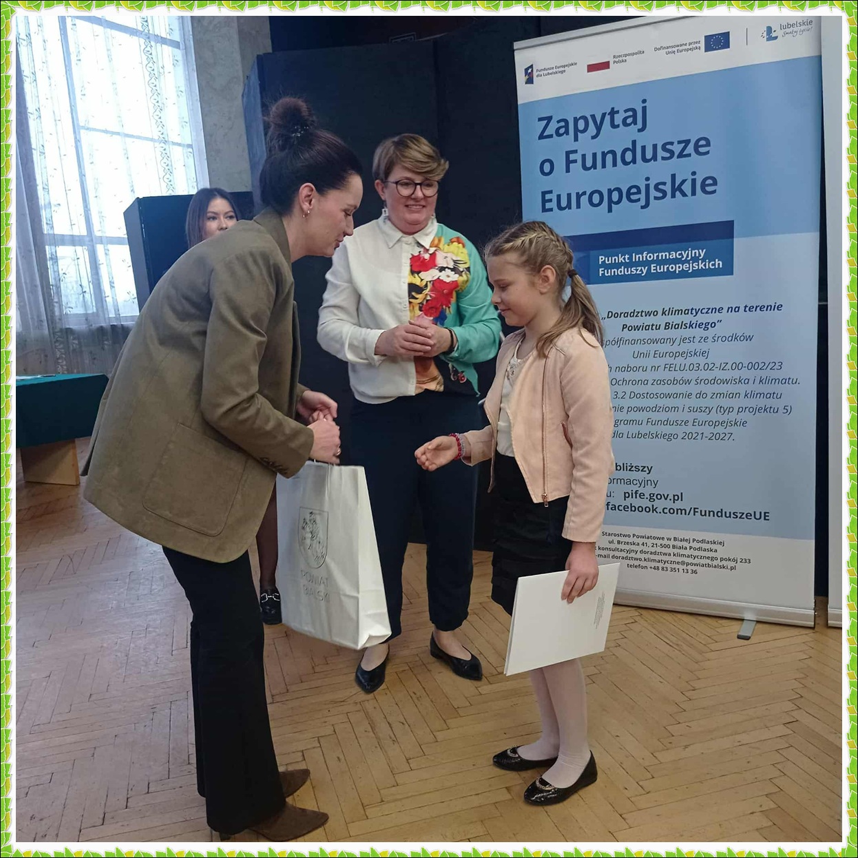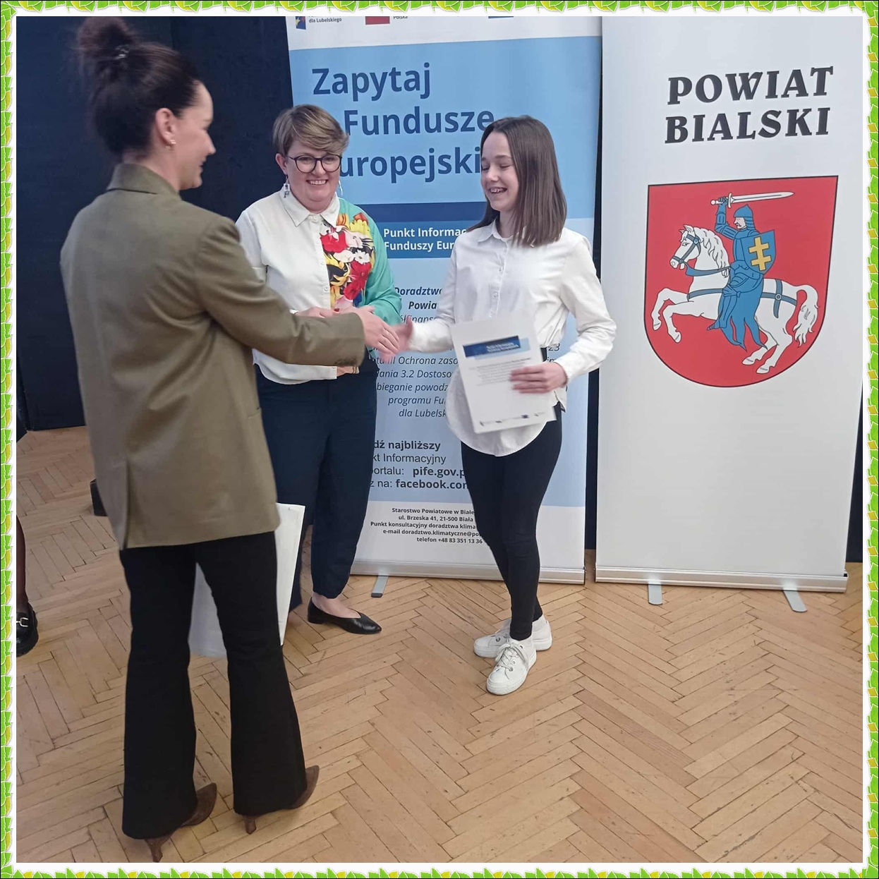 W dniu 21 listopada 2025 roku w Starostwie Powiatowym w Białej Podlaskiej odbyło się uroczyste podsumowanie konkursu plastycznego „Ziemia daje życie – dbaj o nią należycie!”. W konkursie wzięło udział 686 uczniów ze szkół podstawowych z powiatu bialskiego. Wśród laureatów znaleźli się uczniowie naszej szkoły: