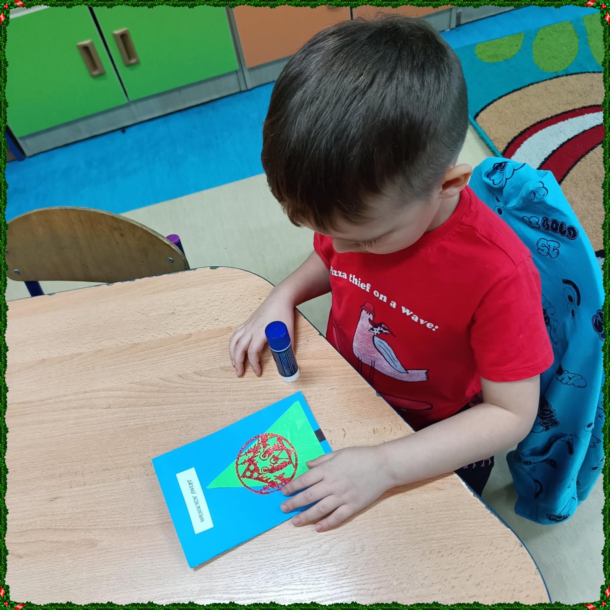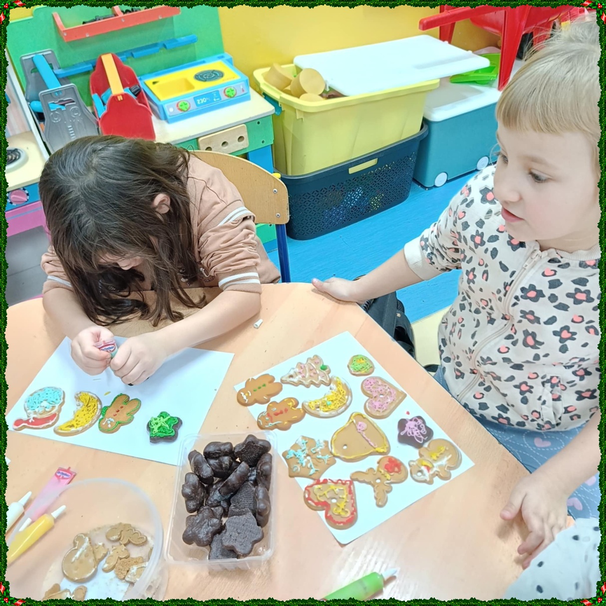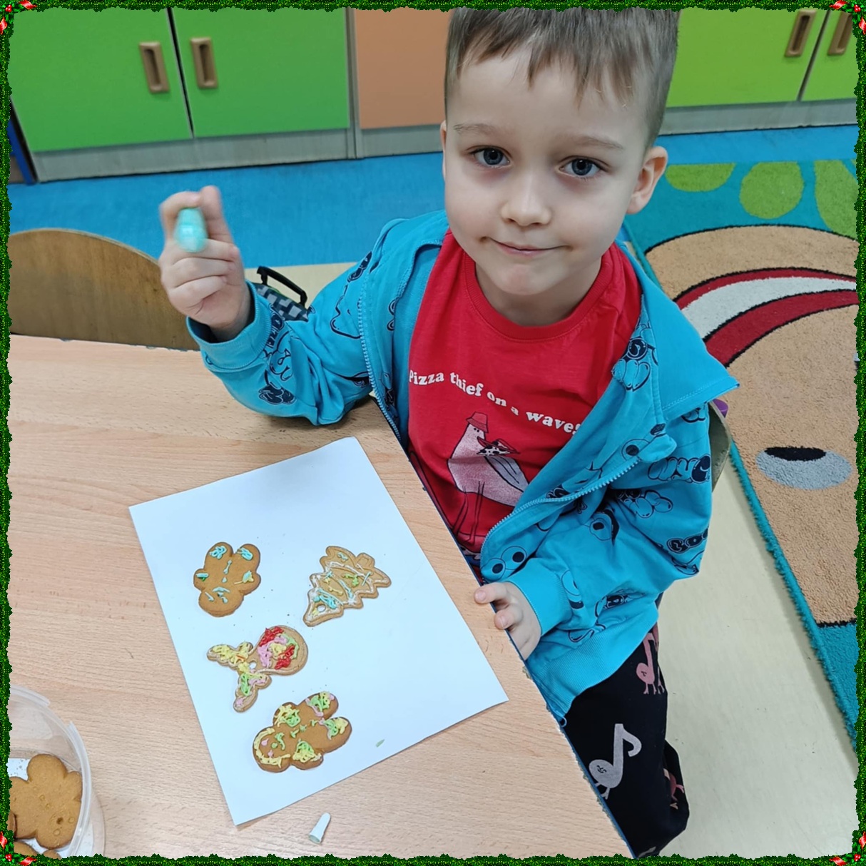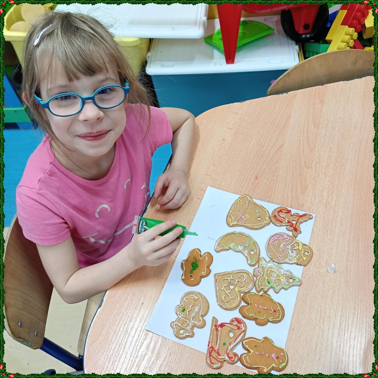 Dzieci z oddziału przedszkolnego z ogromną radością przygotowywały się do Świąt Bożego Narodzenia. Wykonały kalendarz adwentowy, który zabrały do domu aby go złożyć w całość z rodzicami. Przygotowały kartki świąteczne z życzeniami aby sprawić radość najbliższym. Nauczyły się pięknej piosenki i wierszyka o tematyce wigilijnej. Słuchając kolęd ozdabiały pierniczki. To był piękny czas dla wszystkich w oczekiwaniu na Święta Bożego Narodzenia.
