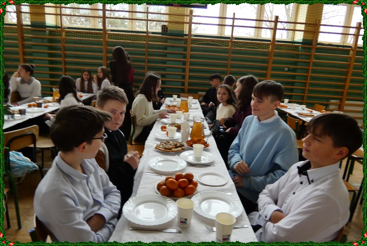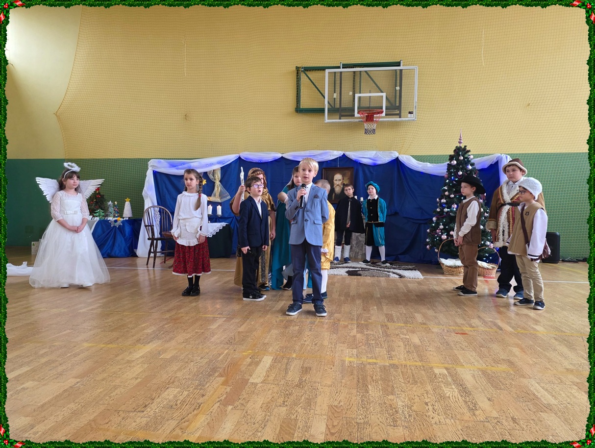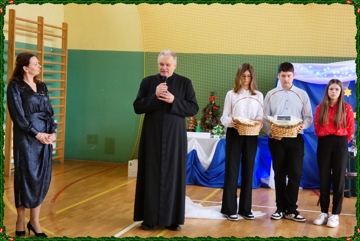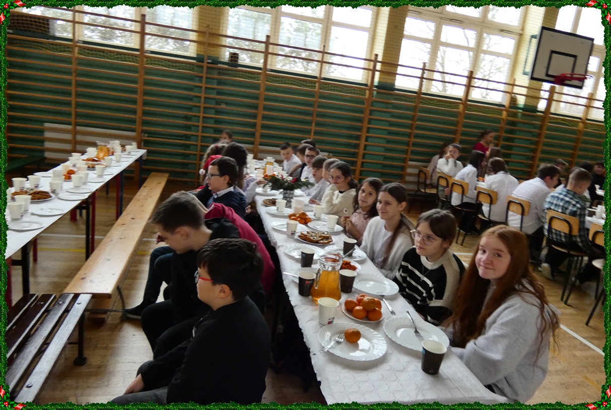 Dnia 19 grudnia w naszej szkole odbyła się wigilia szkolna, która wprowadziła całą społeczność szkolną w świąteczny nastrój. Uroczystość rozpoczęły jasełka w wykonaniu uczniów klasy II, którzy w piękny i wzruszający sposób przedstawili historię Bożego Narodzenia. Następnie uczniowie klasy VIII zaprezentowali wspólne śpiewanie kolęd, które spotkało się z ciepłym przyjęciem zgromadzonych. Podczas spotkania pani dyrektor złożyła wszystkim uczniom, nauczycielom oraz pracownikom szkoły serdeczne życzenia świąteczne. Ksiądz również skierował do zebranych słowa pełne ciepła, życzliwości i bożonarodzeniowej radości. Uroczystość przebiegła w miłej, rodzinnej atmosferze i była pięknym akcentem kończącym okres przedświąteczny.