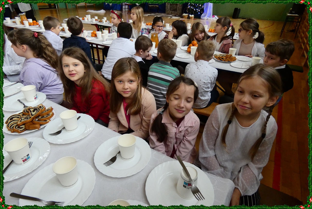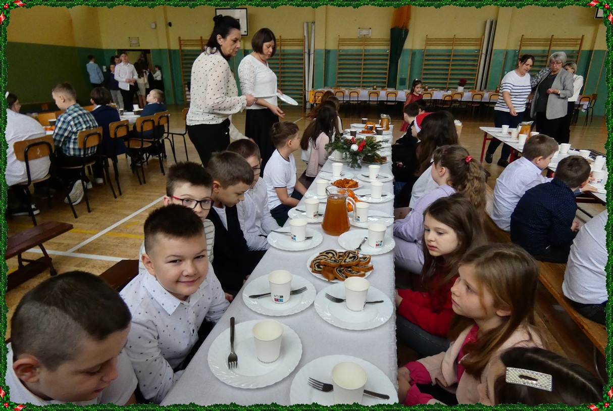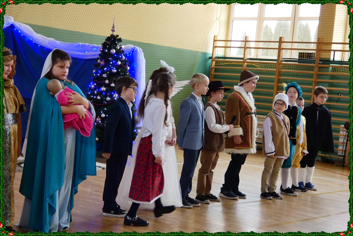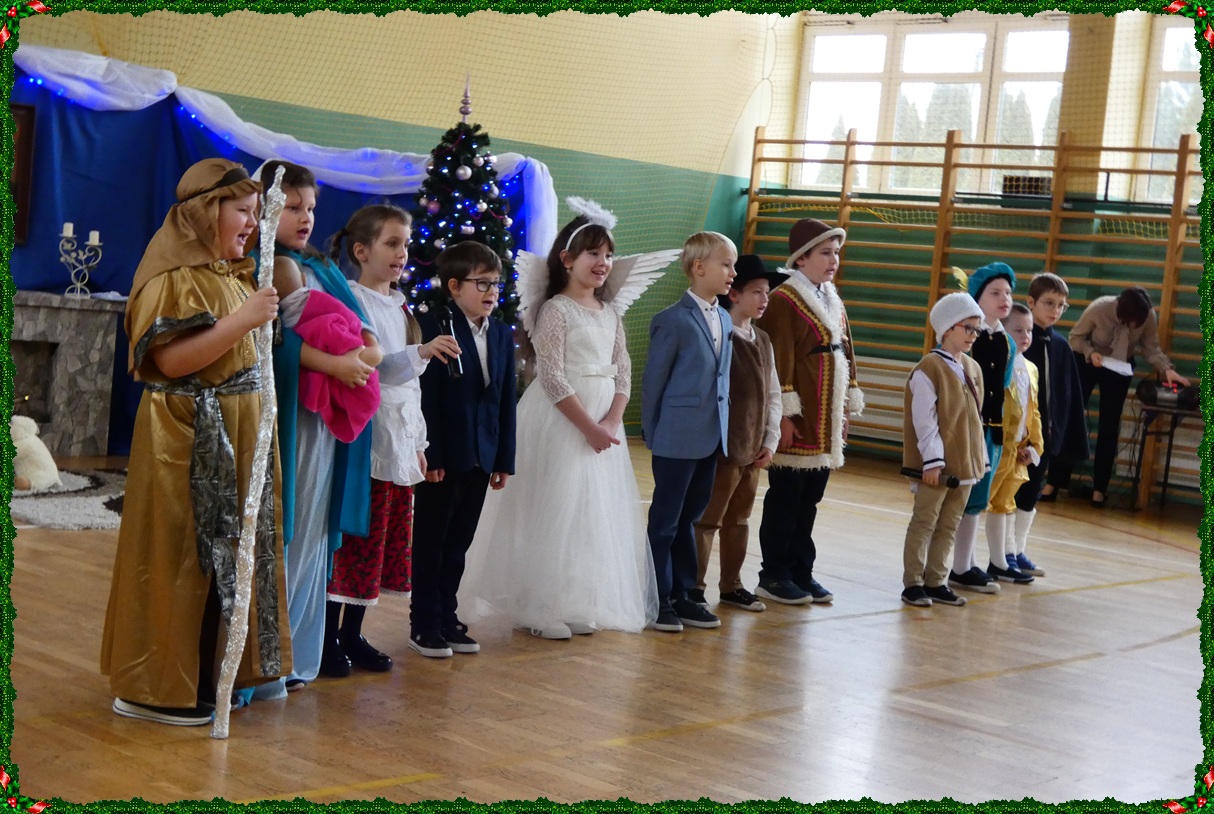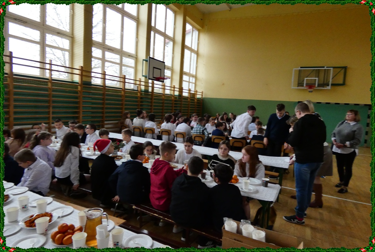 Dnia 19 grudnia w naszej szkole odbyła się wigilia szkolna, która wprowadziła całą społeczność szkolną w świąteczny nastrój. Uroczystość rozpoczęły jasełka w wykonaniu uczniów klasy II, którzy w piękny i wzruszający sposób przedstawili historię Bożego Narodzenia. Następnie uczniowie klasy VIII zaprezentowali wspólne śpiewanie kolęd, które spotkało się z ciepłym przyjęciem zgromadzonych. Podczas spotkania pani dyrektor złożyła wszystkim uczniom, nauczycielom oraz pracownikom szkoły serdeczne życzenia świąteczne. Ksiądz również skierował do zebranych słowa pełne ciepła, życzliwości i bożonarodzeniowej radości. Uroczystość przebiegła w miłej, rodzinnej atmosferze i była pięknym akcentem kończącym okres przedświąteczny.
