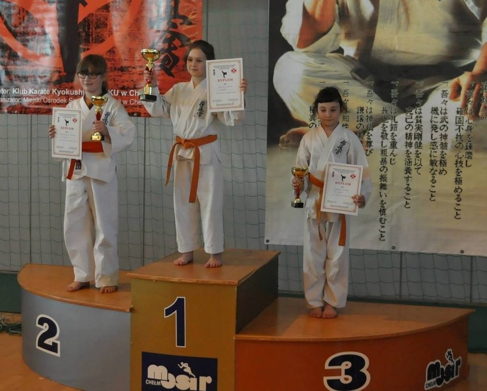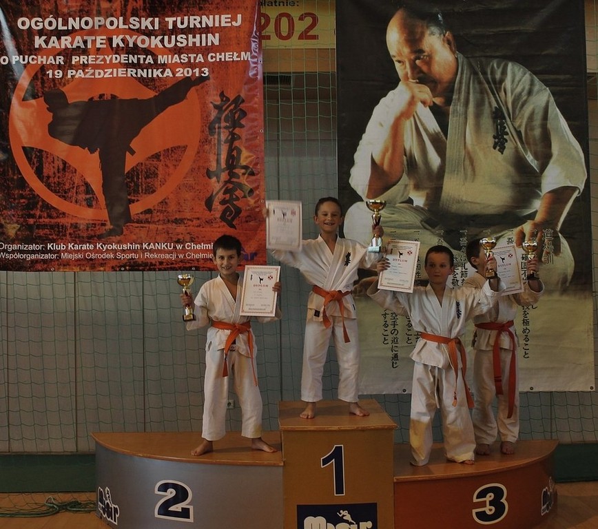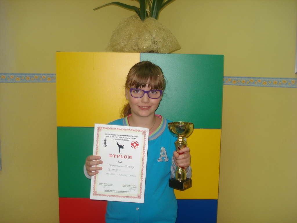 19 października 2013 roku odbył się Ogólnopolski Turniej Karate Kyokushin o puchar Prezydenta Miasta Chełm. W tych zawodach wzięli udział także nasi uczniowie. Na drugim stopniu podium stanęła Patrycja Przybysławska z klasy II. Trzecie miejsce wywalczył Hubert Przybysz z klasy I. Gratulujemy i życzymy dalszych sukcesów.